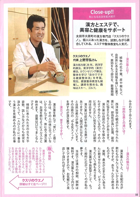 取材 今度はイラストに・・・ 2015年3月28日 最終更新日時 : 2015年3月28日 y-ueno.88 フリーペーパーのふりぺっこ4月号32ページに 「漢方の魅力」ということで取材を受けました。 このなかでも漢方が治療薬としてはもちろんですが、 予防医学としてとらえられる日が来ることが 夢見ています。 また、お茶やコーヒー、紅茶などを飲むように 健康維持、病気の予防として一般的に広がっていくように これからも研究して少しでもお役に立てるように 精進していきたいと思っています。 「出ていましたね!」と言われるのが恥ずかしいです。 今度は、顔に自信がないのでイラストにしてもらいます。