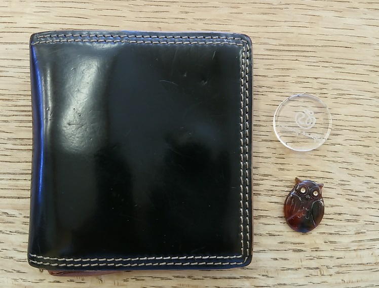 「黒いコードバンで中に透明のコインと鼈甲の亀が入っています!」
