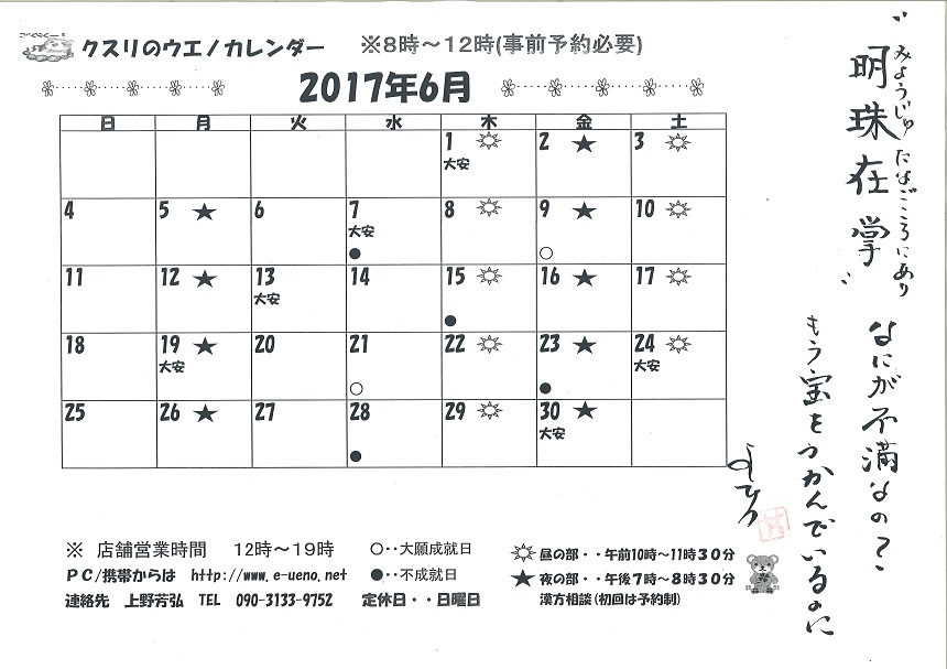 2017年度6月 おしらせ・・・ 2017年6月1日 最終更新日時 : 2017年6月1日 y-ueno.88 今年は、例年より湿度が高いようです。 気温が高くなくても湿度が高いと 熱中症になりやすいので気をつけてください。 ダイエットしたい人は、そろそろ本気を出しましょう! 6月も、通常通り営業。 整体教室休み・・・なし。 補講・・・・・・・なし。 ≪今月のことば≫ “明珠在掌(みょうじゆたなごころにあり)” 何が不満なの? もう宝をつかんでいるのに! よしひろ