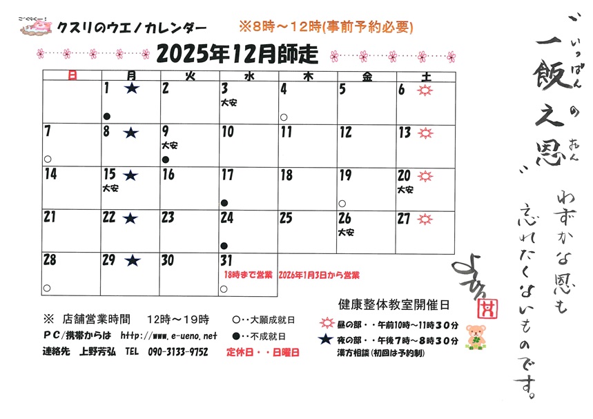 ※12月も日曜定休のみ通常営業です。
